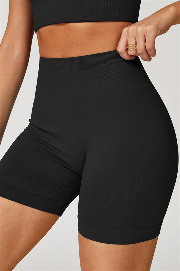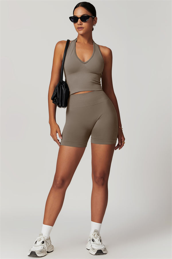 Show off your curves with this elegant and functional matching set, featuring a halter top and shorts crafted for both style and performance. The halter top boasts a deep V-neckline that highlights your collarbones for a touch of sophistication, while the ribbed design adds texture and visual appeal. The high-waisted shorts are designed with a vertical ribbed waistband, providing a secure fit that sculpts your waistline and offers a flattering, streamlined look.
