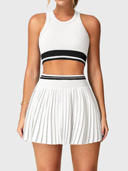 Step onto the court with streamlined confidence. The Hebe tennis outfit set pairs a sleek racerback tank with a playful pleated skirt—designed for movement, breathability, and all-day energy. Four-way stretch and built-in support keep you ready for every serve, swing, and stride.