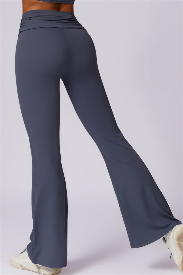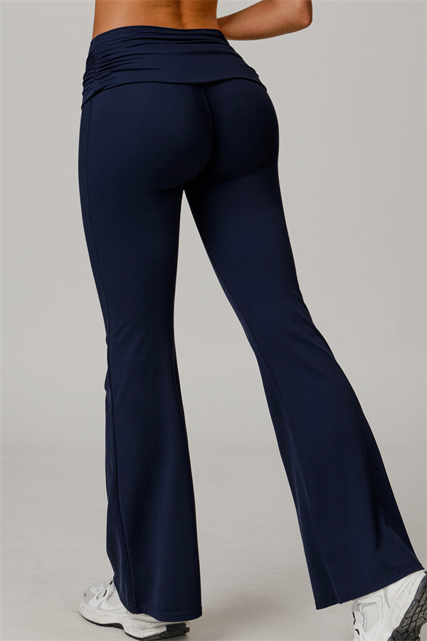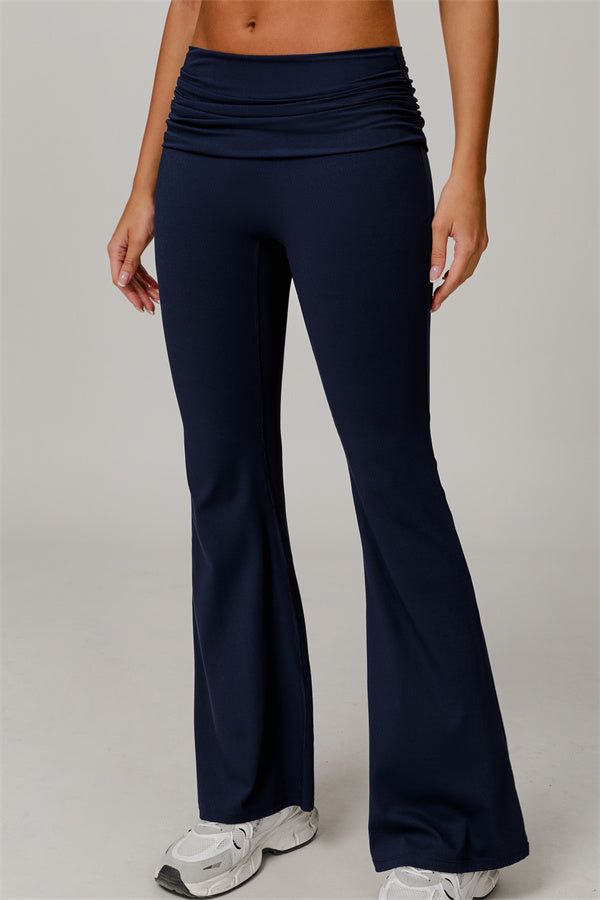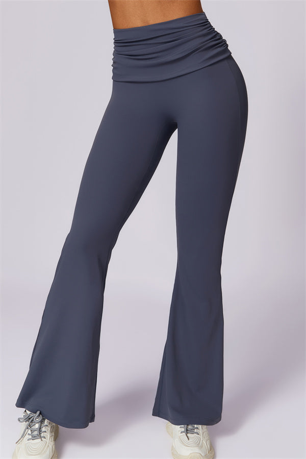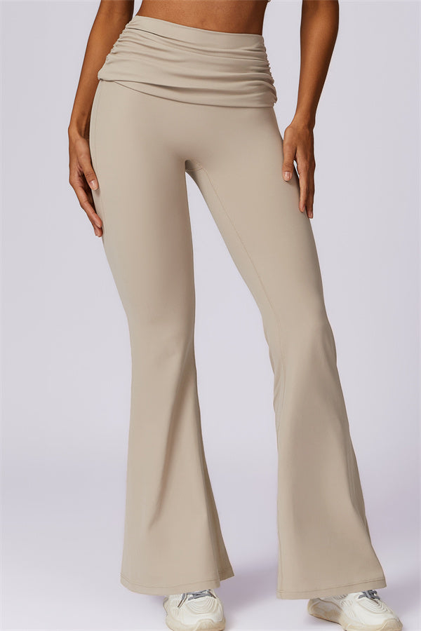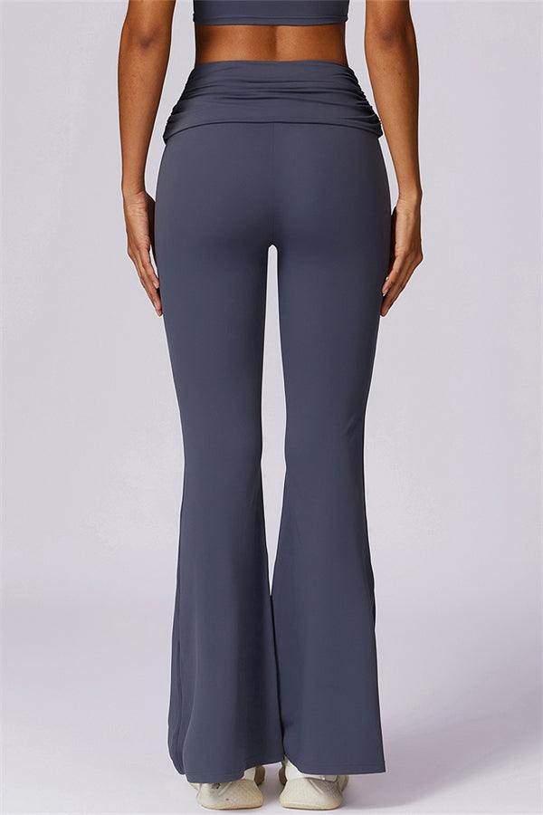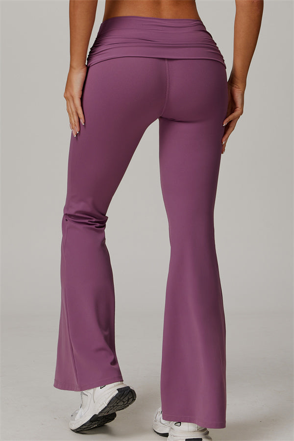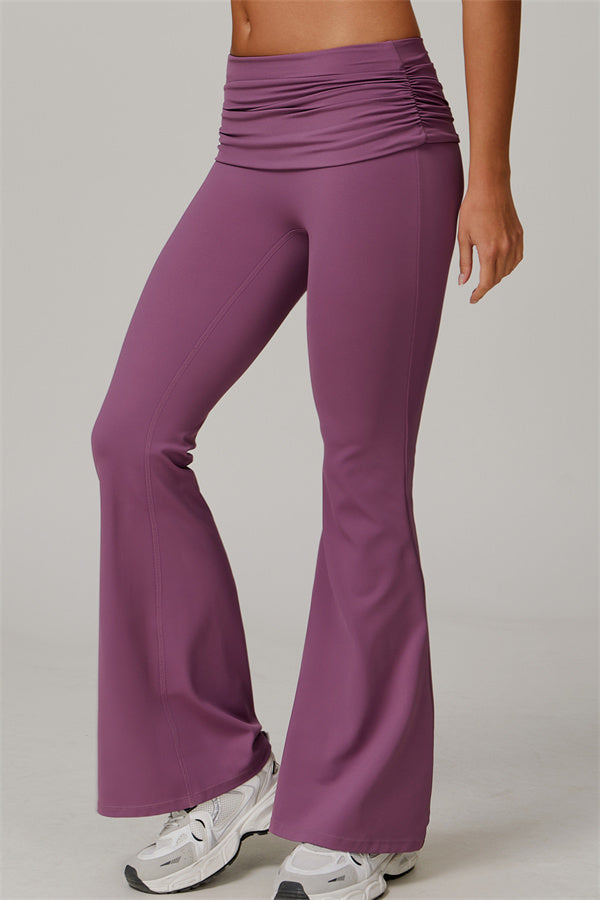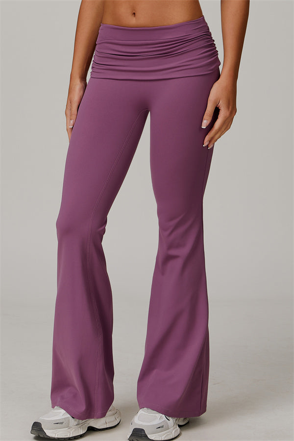 Introducing our stylish flared leggings, designed to effortlessly flatter your figure. The ruched fold-over waistband gently conceals any tummy concerns,...