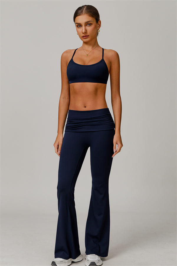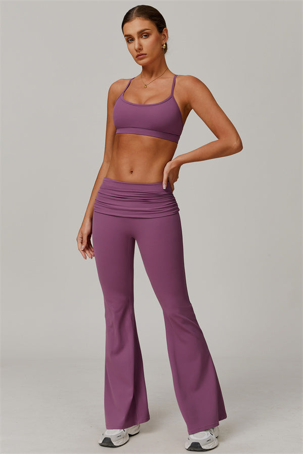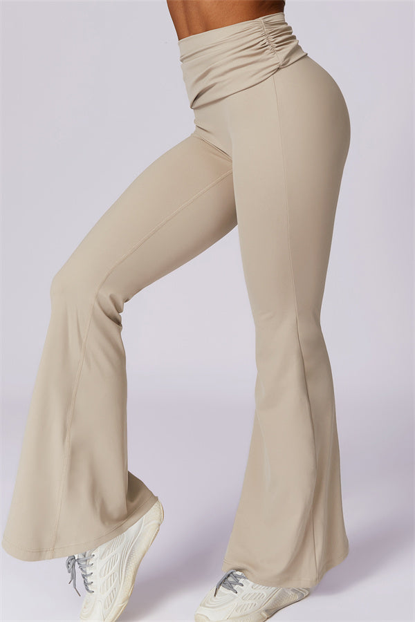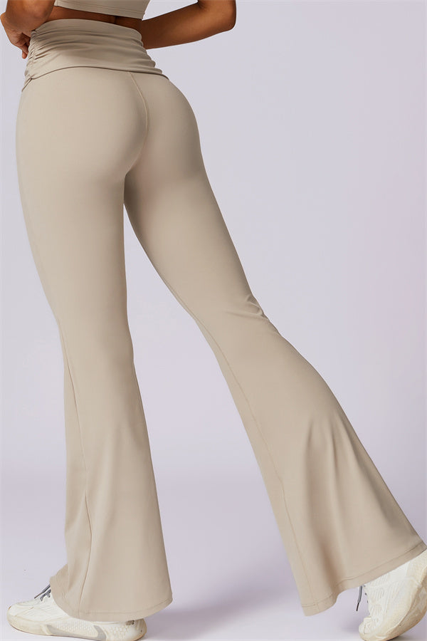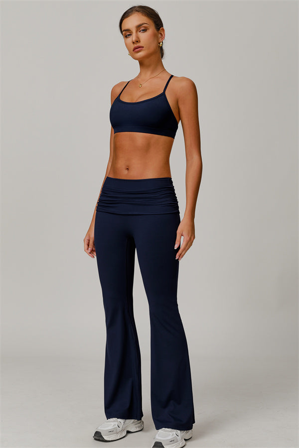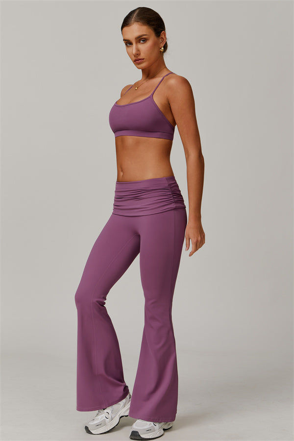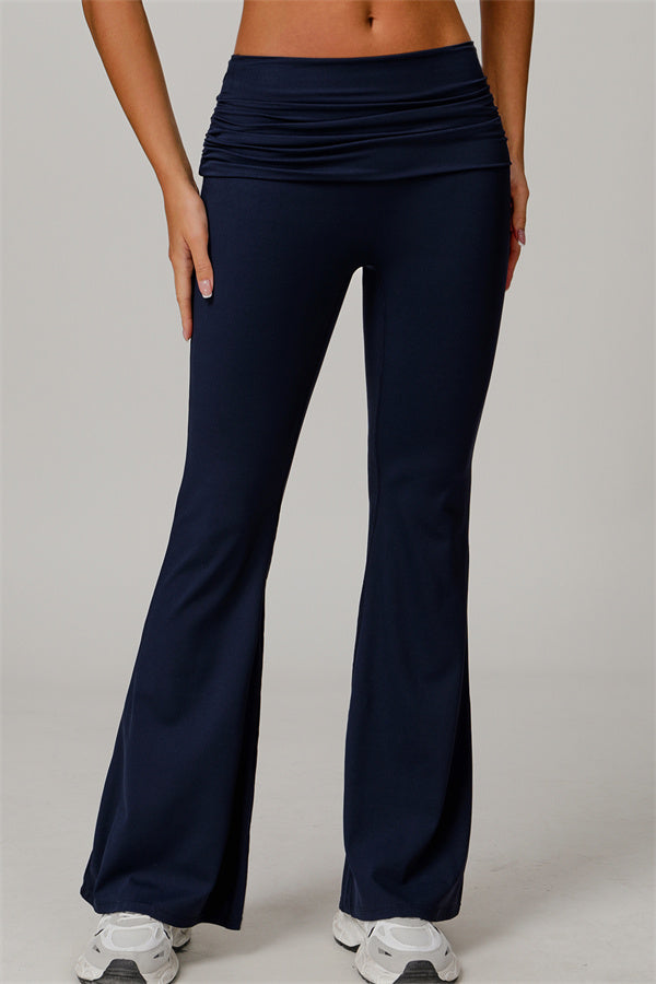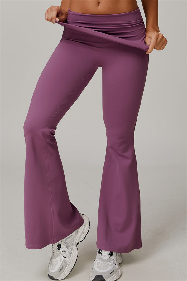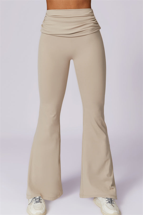 Introducing our stylish flared leggings, designed to effortlessly flatter your figure. The ruched fold-over waistband gently conceals any tummy concerns,...