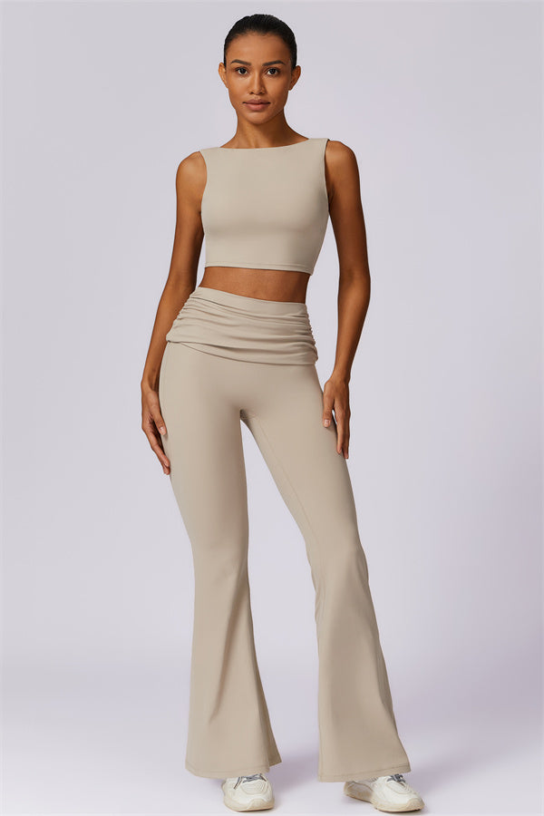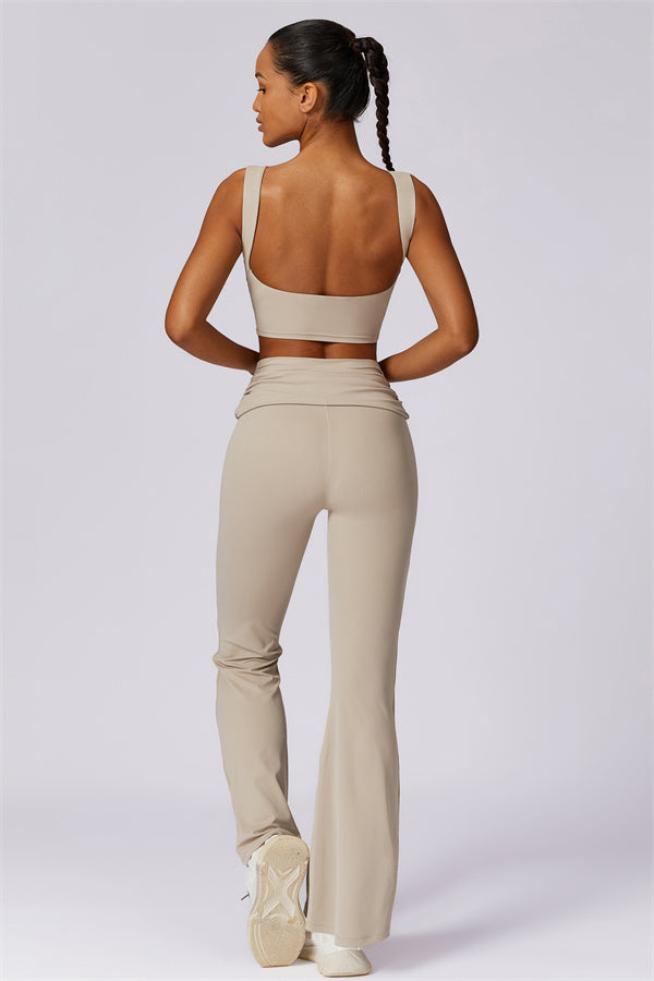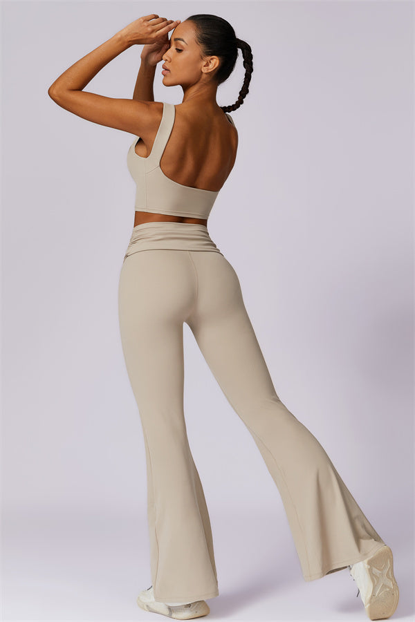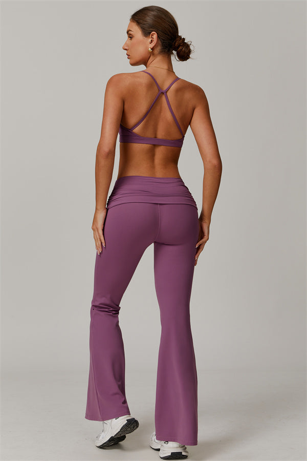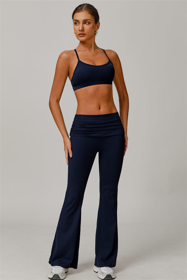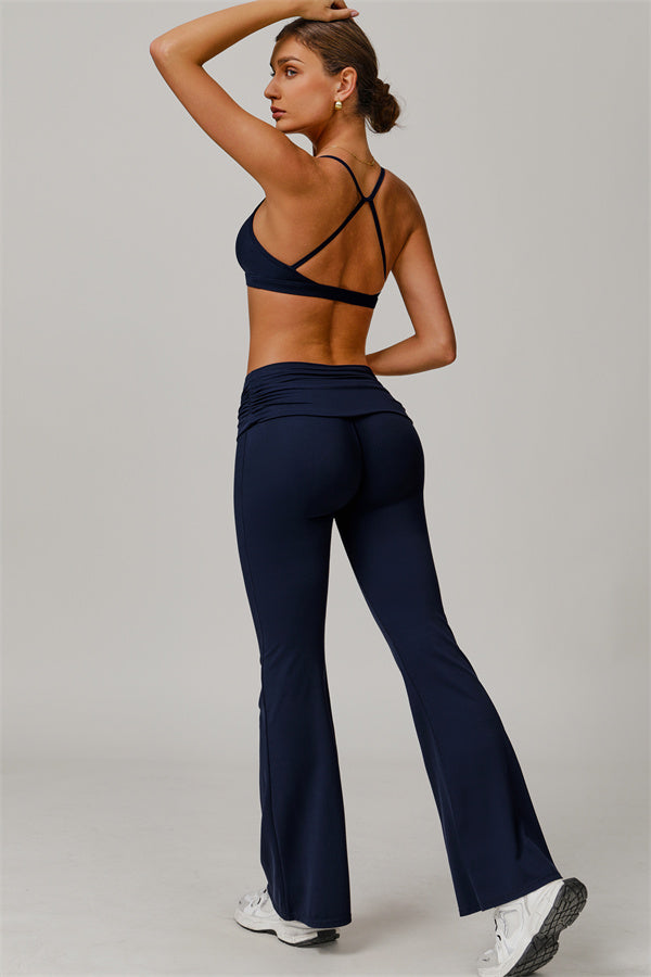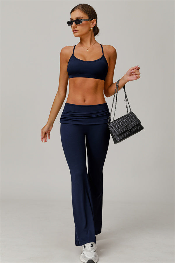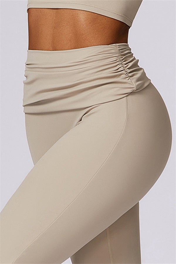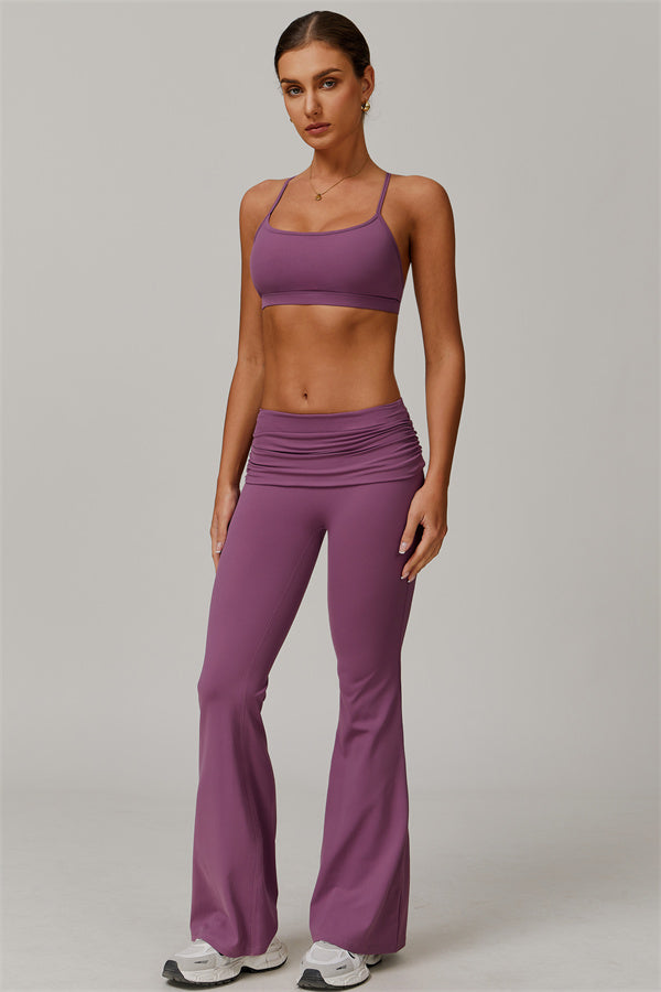 Introducing our stylish flared leggings, designed to effortlessly flatter your figure. The ruched fold-over waistband gently conceals any tummy concerns,...